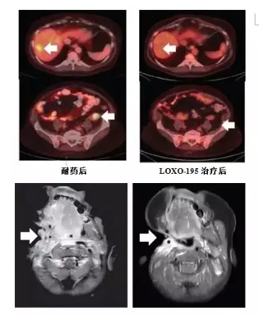 尽管,当前已经有一些参与拉罗替尼临床试验的患者出现了耐药。但可喜的是,依据拉罗替尼的耐药机制,第二代TRK靶向药物LOXO-195已经被FDA批准正式开展临床试验,专门来对抗耐药新突变,且已在部分耐药患者的治疗中取得了较好成效,具体如下: